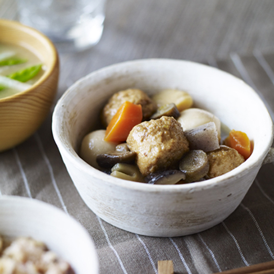 名古屋コーチン入りの味わい深いつくねと、存在感のあるたけのこ、にんじん、ごぼう、さといもなどの野菜を白出汁でやさしい味に仕上げました。
